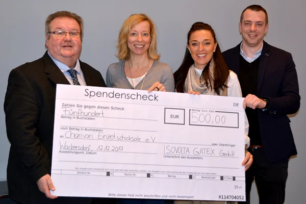 Geschäftsführer Simon Strähl und Josef Biersack übergaben mit großer Freude an Madlén Kahls (2.Vorstand Einzelschicksale e.V., rechts) und Tanja Gruber-Meindl (Schriftführerin) den Scheck.